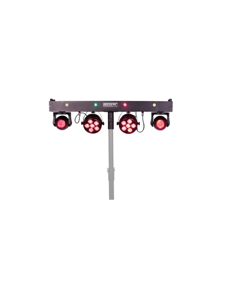- Sources de lumière : 2 Lyres 40W RGBW (4-en-1) | 2 Par Slim 6x8W (4-en-1) | 2 Lasers : Rouge 130mW et Vert 50mW | 2 Strobes 10W (Blanc)