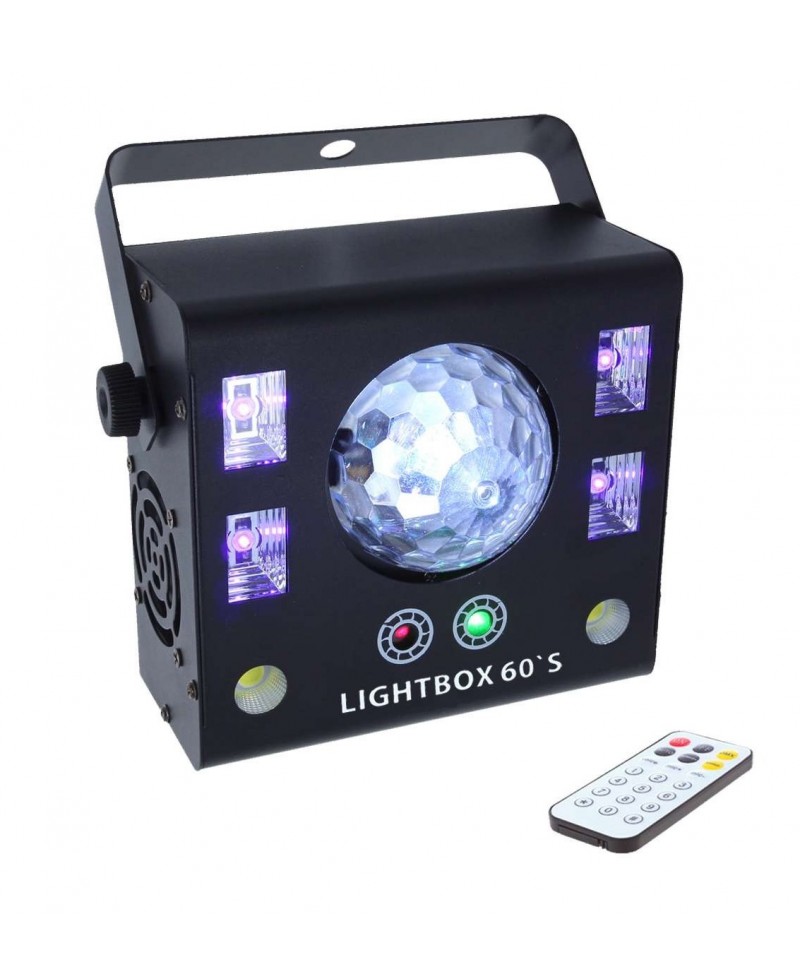 Le LIGHTBOX 60’S est un jeu de lumière multi-effets proposant quatre éclairages différents. Il est composé d’un Sphéro Magic Ball rotatif à 340° d’une puissance de 15W RGBW 4in1 (OSRAM LED), d’une lumière noire à Led d’une puissance de 12W totale, d’un stroboscope de 20W et d’un effet laser multipoints de 80Mw en vert et rouge. Lyre de suspension intégrée pour une installation simple rapide. Idéal bars, clubs, soirée, birthday party et autres lieux de loisirs.