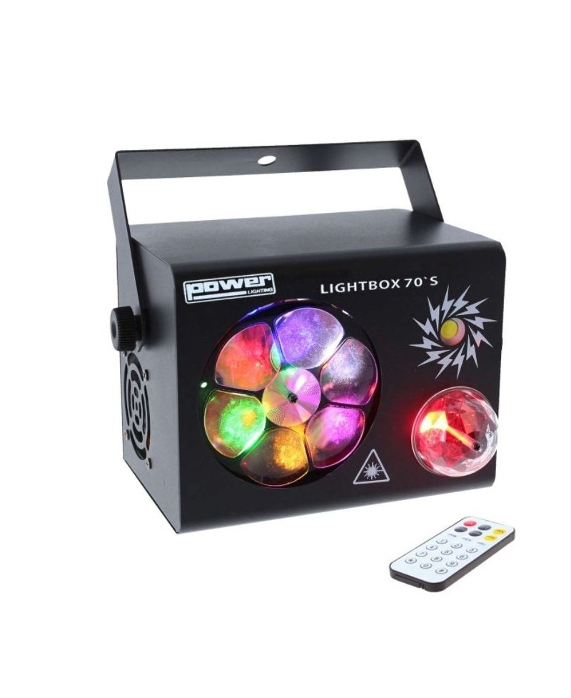 Le LIGHTBOX 70’S est un jeu de lumière multi-effets proposant quatre éclairages différents. Il est composé d’un Sphero Magic Ball rotatif à 340° d’une puissance de 9W RGB 3in1, d’un effet multi Gobos d’une puissance totale de 12W à LED, d’un stroboscope de 10W et d’un effet laser multipoints de 80Mw en vert et rouge. Lyre de suspension intégrée pour une installation simple rapide. Idéal bars, clubs, soirée, birthday party et autres.