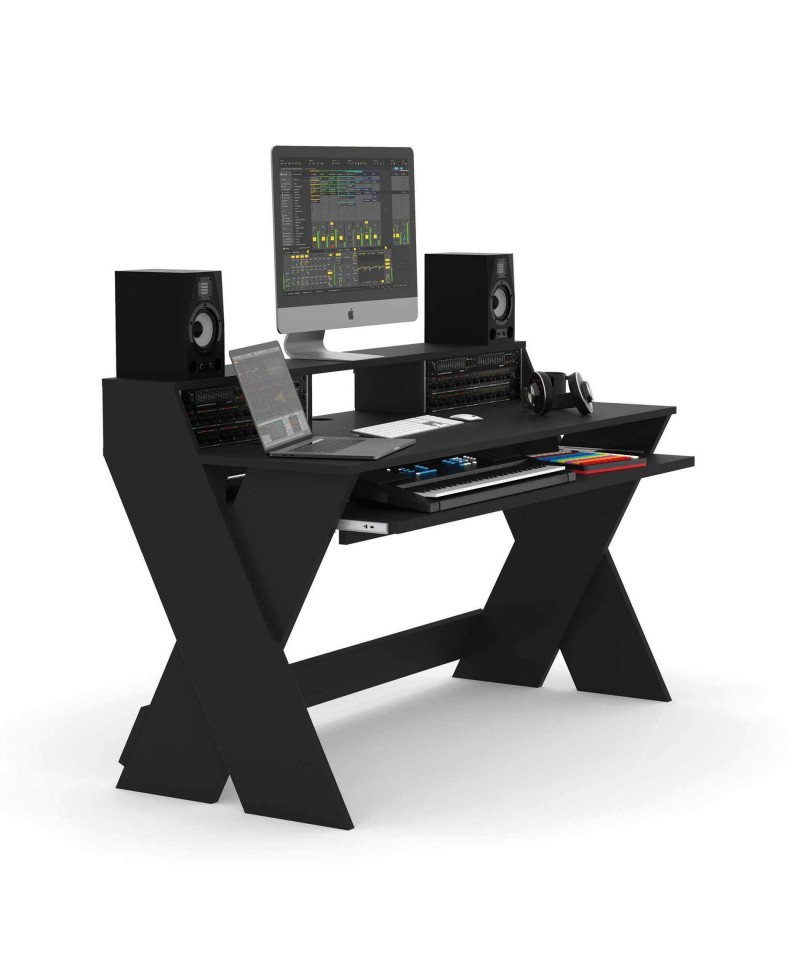 - Offre suffisamment d'espace pour installer un ordinateur fixe/portable, un écran, des moniteurs de studio, une interface audio, un équipement en rack de 19", des contrôleurs MIDI, des synthés et un clavier maître.