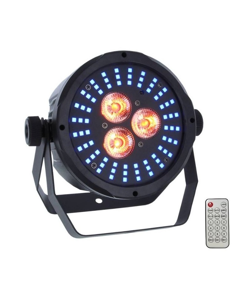 Le PAR SLIM IZO est un projecteur 2-en-1 permettant d’une part un éclairage WASH direct ou indirect avec 3 x LEDs de 18W Hexa (6-en-1) et d’autre part il est équipé d’une couronne de 72 LEDs SMD (composée de 24 rangées de 3 Leds) produisant de superbes effets d’animations visuelles pour plus d’applications variant le sens de rotation des Leds, les couleurs, l’intensité, les superbes programmes internes, le strobe ect... Le PAR SLIM IZO vous permettra de créer des ambiances feutrées ou dynamiques selon vos envies lors de vos prestations ou de vos soirées. Une télécommande IR est incluse pour un usage simple et pratique.