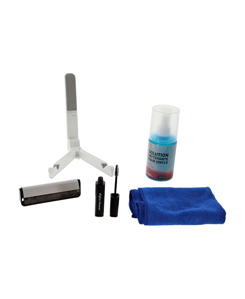 Kit de nettoyage pour disque vinyle 5-en-1. Il comprend différents accessoires pour permettre un entretien optimal de votre vinyle : La brosse en fibre de carbone extrêmement fines (plus petites que la taille d’un cheveu) offre un nettoyage doux et permet de retirer délicatement la poussière des surfaces vinyles. Les solutions nettoyantes et tissu en microfibres vous permettront de retirer rapidement les saletés de vos vinyles et diamants.