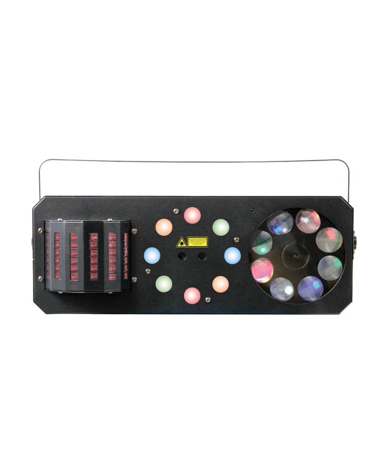 Caractéristiques techniques : - Effet Derby : 2 LEDs de 10W RGBW 4-en-1 - Effet Wash : 8 LEDs de 1W RGBA (2 Rouge, 2 Vert, 2 Bleu, 2 Ambre) - Effet 8 Gobos : 8 LEDs de 3W RGBW (2 Rouge, 2 Vert, 2 Bleu, 2 Blanc) - Laser multipoints 130mw RG (Rouge et Vert) + Gobos - 3 modes de fonctionnement : son, mode show, DMX - Mode DMX : 23 canaux - Paramétrage des modes : Autonome ou Maître/Esclave - Panneau arrière : écran d’affichage avec 4 boutons de contrôle DMX, entrée et sortie IEC AC pour une alimentation en chaine par câbles XLR 3 broches - Télécommande infrarouge incluse - Alimentation : AC 220V-240V, 50/60Hz - Consommation : 62W - Dimensions (L x P x H) : 403 x 180 x 148 mm - Poids : 3,10 Kg
