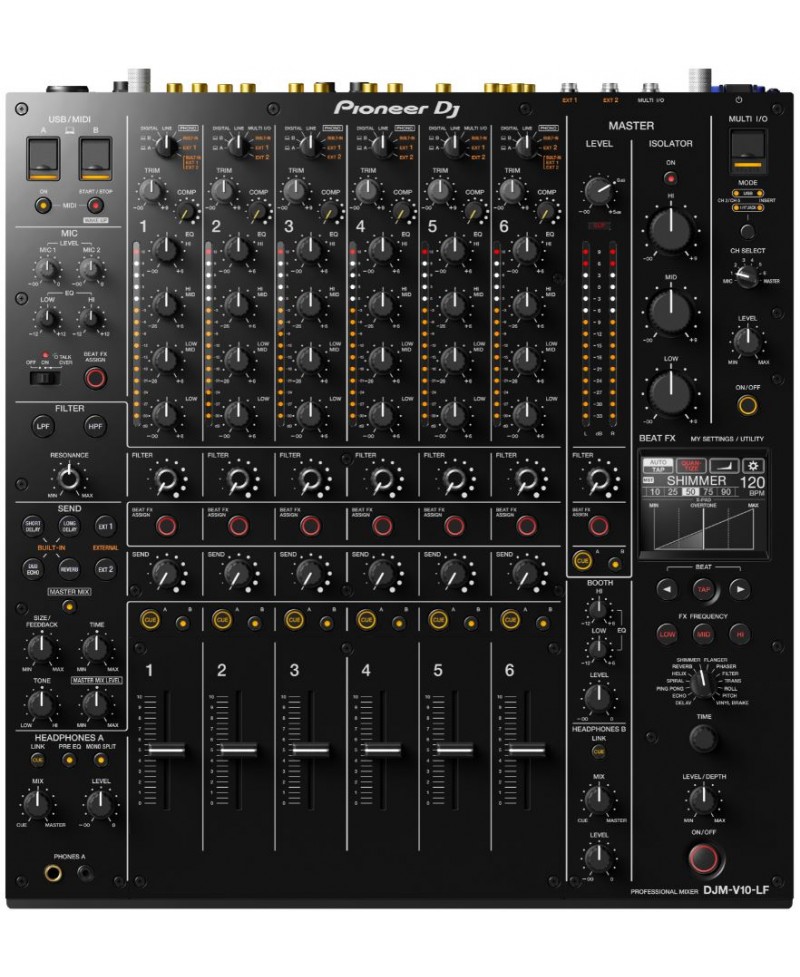 Voici la DJM-V10-LF de Pioneer DJ, une table de mixage DJ professionnelle 6 voies créative avec des faders longues courses pour des mixes fluides et précis. La DJM-V10-LF est dotée d'un égaliseur 4 bandes et d'un filtre par voie. Section Send / Return complète. Cette dernière version de la DJM-V10 dispose de faders de voies plus grands, avec des courbes optimisées et un nouveau préréglage de courbe qui permet de réaliser des transitions fluides et précises. La DJMV10LF est également équipée d'un isolateur 3 bandes sur la sortie master mais aussi d'un égaliseur sur la sortie DJ Booth. Cette nouvelle table de mixage DJ Pioneer DJ est résolument l'arme absolue pour les clubs et les DJ exigeants.